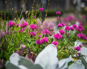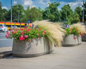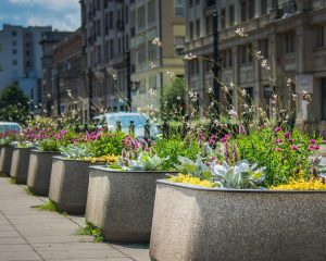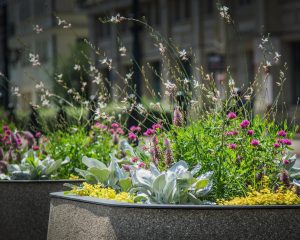 Zachwycają rośliny w donicach przy ulicy Marszałkowskiej, np. nad Trasą Łazienkowską zobaczymy kompozycje złożone ze wspomnianego starca srebrnolistnego, ale również uroczego, pochodzącego z Australii Ptilotus ‘Joey’ – o delikatnie różowych kwiatach. Dopełnieniem kompozycji są gomfreny ‘Truffula Pink’ o niedużych różowych kwiatach, wysokie gaury i żółta tojeść rozesłana.