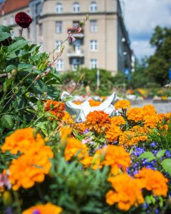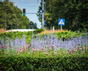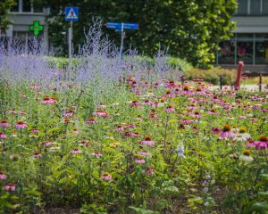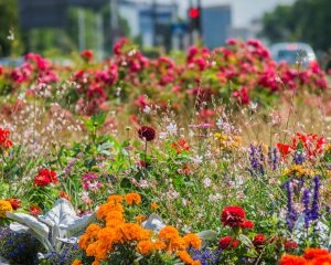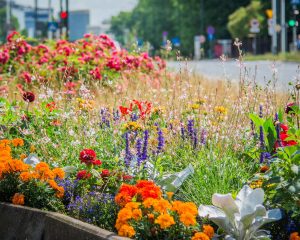Kolorowo zrobiło się przy ul. Wawelskiej – są tu m.in. lobelie przylądkowe ‘Blue Carpet’, pomarańczowe aksamitki rozpierzchłe ‘Disco Orange’, wielobarwne, pochodzące z Meksyku cynie wytworne ‘Mondo Mix’, jeżówki, dalie ‘Franz Kafka’ Są też pacioreczniki i rudbekie, krwawniki pospolite ‘Cerise Queen’ oraz fioletowe szałwie omączone.