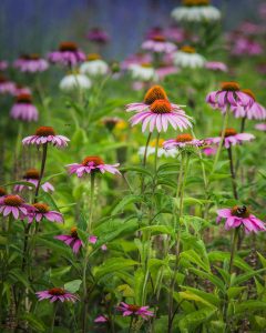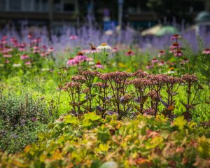 Nie sposób nie zwrócić uwagi na rabatę bylinową pośrodku ronda Waszyngtona – nad jeżówkami purpurowymi górują delikatne perowskie łobodolistne. Z nimi ładnie się komponują ostróżki, rozchodnik wielki ‘Chocolate drop’ o czekoladowej barwie liści i trzcinnik ostrokwiatowy.