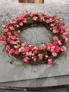 Podstawą pracy były splecione pędy, w które wplecione były kolorowe kwiaty z różnych siedlisk na całym globie. Od egzotycznych storczyków Vandy i anturium i strelicji poprzez pomarańczowe uwielbianej przeze mnie gloriozy po tulipany. Czego tam nie było! Bordowy krwiściąg, który spotkamy na naszych łąkach przez gałązki błękitnego clematisa po pochodzący z antypodów Anigozanthos. Bordowa cantedeskia goździki, róże, gerbery, nerina po seledynowe pędy kaliny koralowej.