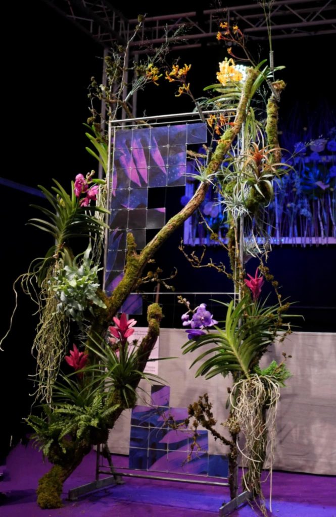 „Praca florystyczna ukazuje zderzenie dwóch światów – rzeczywistości cyfrowej i natury. Metalowa rama stanowi konstrukcję dla organicznych form, które zdają się wplatać w pikselową strukturę stworzonych z plexiglasu i zdjęcia elementów. Piksele symbolizują sztukę cyfrową, stanowiącą nową rzeczywistość, w której natura i technologia współistnieją i przenikają się nawzajem. Naturalne materiały, takie jak mech, gałęzie, kokedamy i paprocie, wprowadzają element życia i odrodzenia. Ich intensywna, zielona barwa kontrastuje z chłodną, geometryczną strukturą pikseli, co podkreśla granicę między światem organicznym a wirtualnym. Kolorystyka fioletowa, magenta i różowa w kwiatach symbolizuje przebudzenie i energię natury, podczas gdy suche trawy i oplątwy (tilancje) w brązowych odcieniach są metaforą przemijania i ulotności. Kompozycja oparta na wzajemnym przenikaniu elementów cyfrowych i organicznych stawia pytanie o granice między rzeczywistością a fikcją. Czy natura jest w stanie przetrwać w nowej, wirtualnej rzeczywistości? Czy może właśnie technologia staje się częścią natury? Praca zdaje się pozostawiać odpowiedź otwartą, prowokując do refleksji nad współczesnym światem i jego transformacją.”