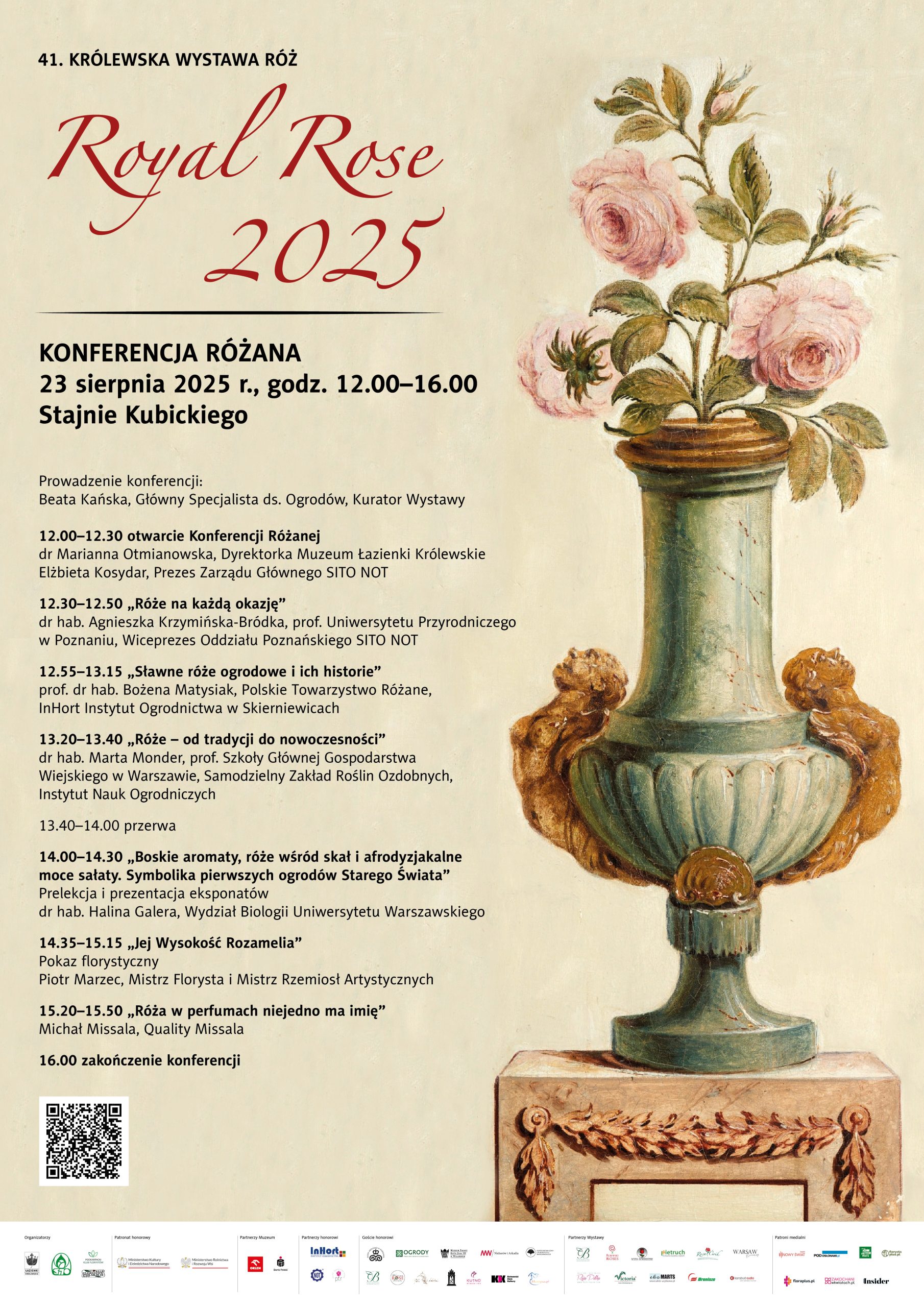 Najważniejszą częścią tego wydarzenia będzie konferencja Różana Prowadzi ją : Beata Kańska, główny specjalista ds. ogrodów w Muzeum Łazienki Królewskie, kurator „Royal Rose 2025”.