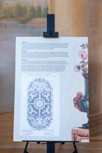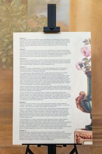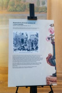 Duża część wystawy została poświęcona pokazaniu zapisków z pierwszej, historycznej wystawy róż w Łazienkach Królewskich, która odbyła się w 1882 roku. Na kilku tablicach pokazana jest geneza wystawy, konkursy, które towarzyszyły pierwszej wystawie róż. Nie mogło również zabraknąć rycin i opisów rabat różanych oraz innych, które wtedy można było podziwiać w ogrodach Łazienek Królewskich.