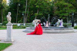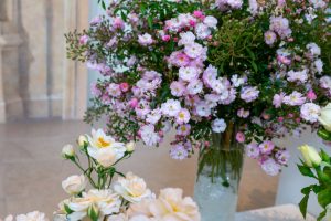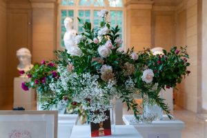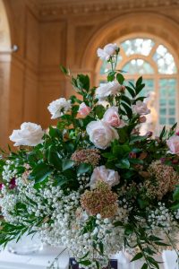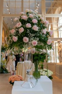 Bukiety róż prezentowane były w szklanych wazonach. Ponieważ szkło jest bardzo klasycznym, ale i dyskretnym materiałem, róże prezentowały się przepięknie a prostota szklanych wazonów nie tworzyła żadnej konkurencji ani dla kwiatów, ani- co też należy podkreślić- dla unikatowych wnętrz Starej Oranżerii, wypełnionej klasycznymi rzeźbami i pokrytej ozdobnymi freskami. Całe pomieszczenie, nie małe przecież, wypełnione było kwiatami, co wraz z resztą przestrzeni nadawało poczucie wyjątkowego wydarzenia w niebanalnej przestrzeni.